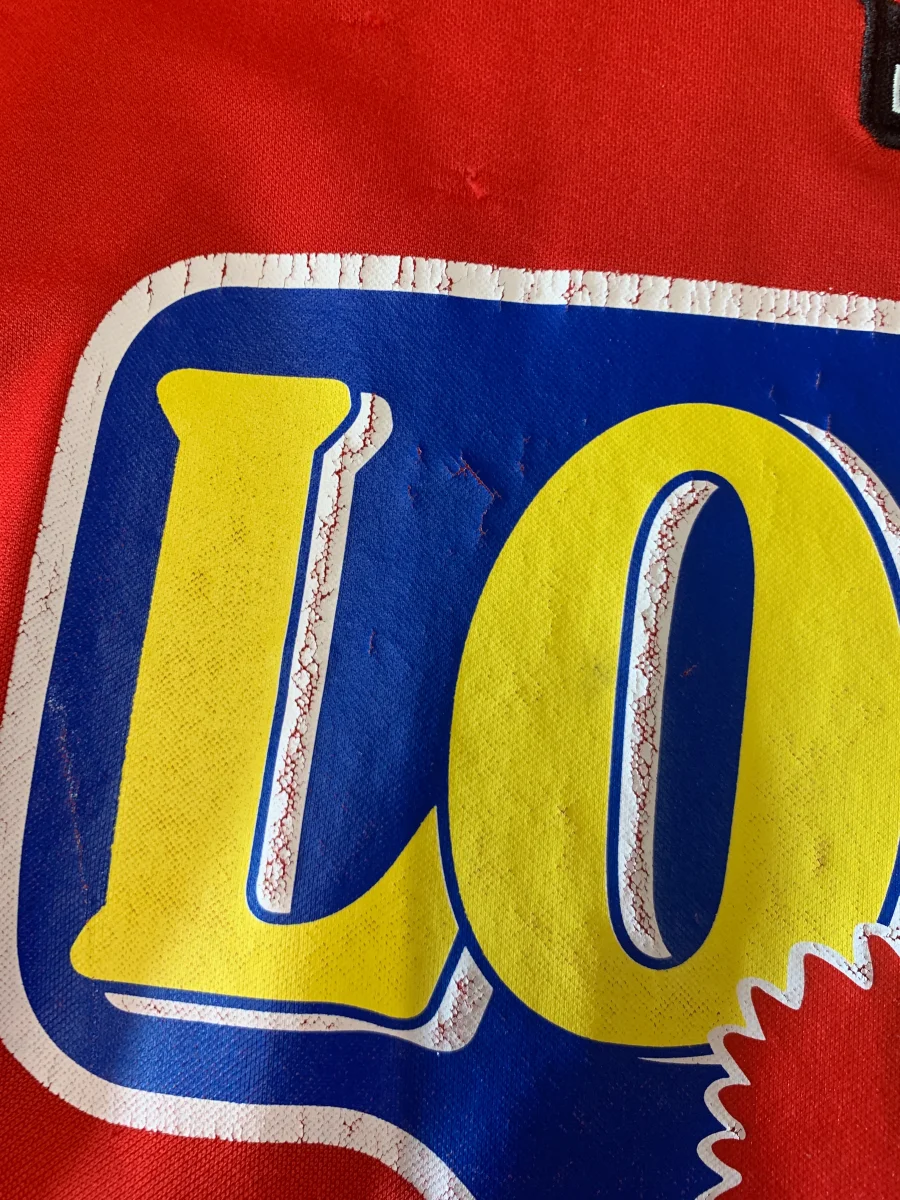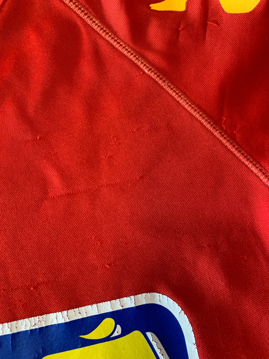 Zoom produit : Maillot en état moyen présentant des fils tirés et le sponsor abimé