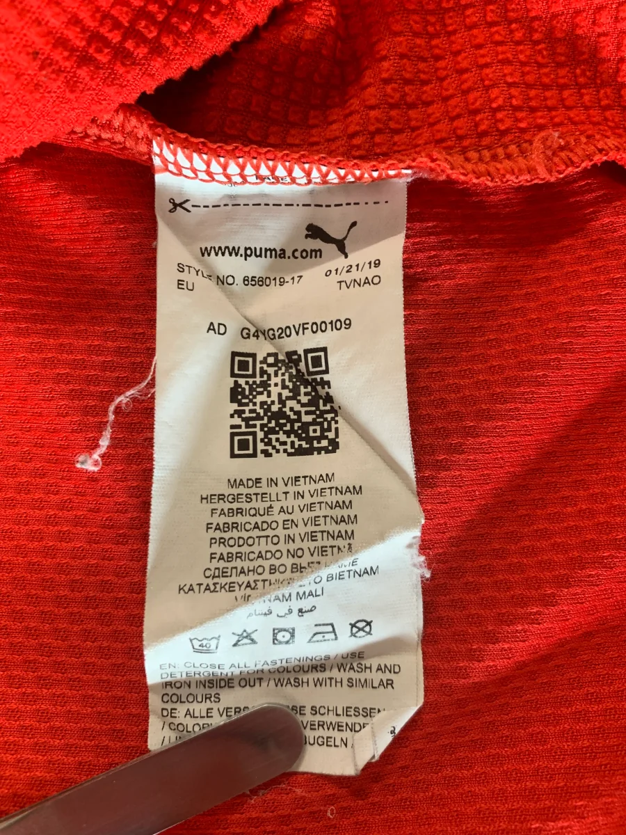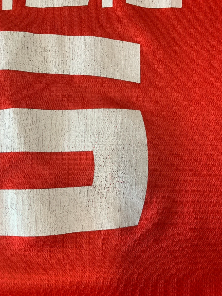 Zoom produit : Maillot en moyen état. taille XL enfants – 13-14 ans 164cm correspond pour un S adulte – Le sponsor est craquelé