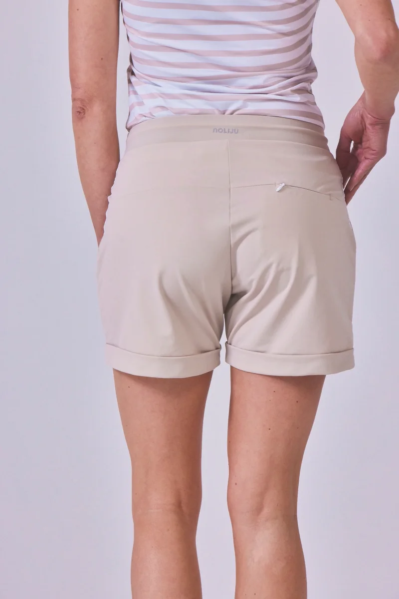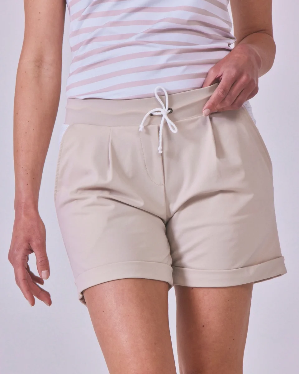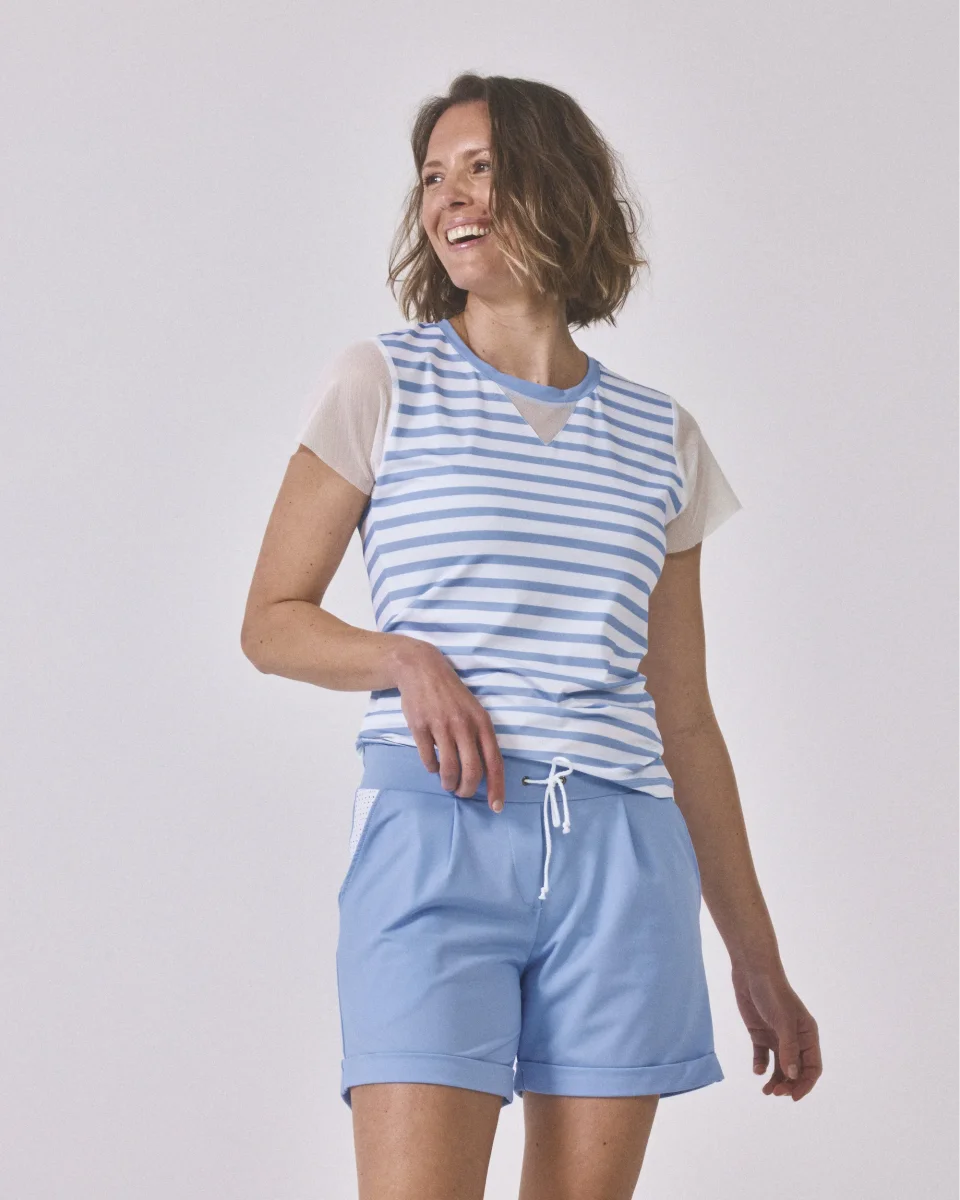 L’idée de mixer l’esprit du bleu ciel ou bien beige sur un vêtement technique avec les détails d’un short de ville nous semblait particulièrement séduisante : le confort d’un tissu technique et respirant et l’esthétique d’un short urbain. Un combo qui fonctionne !