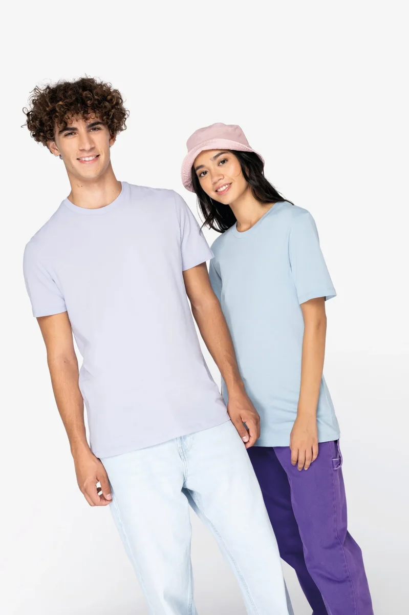 Coton peigné. Encolure ronde en bord-côtes avec élasthanne. Bande de propreté ton sur ton à l’encolure. Coupe Tubulaire. Finition double aiguille bas de manches et bas de vêtement.