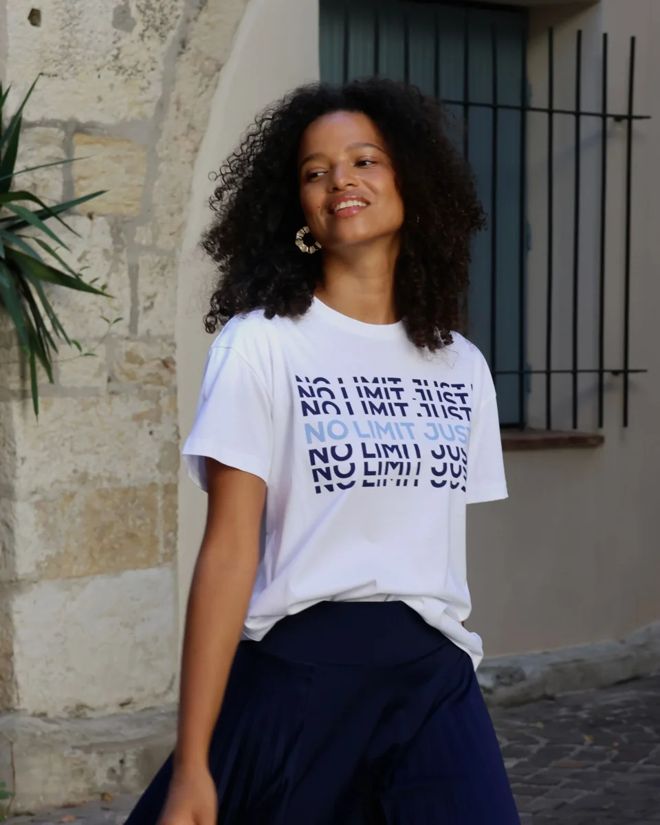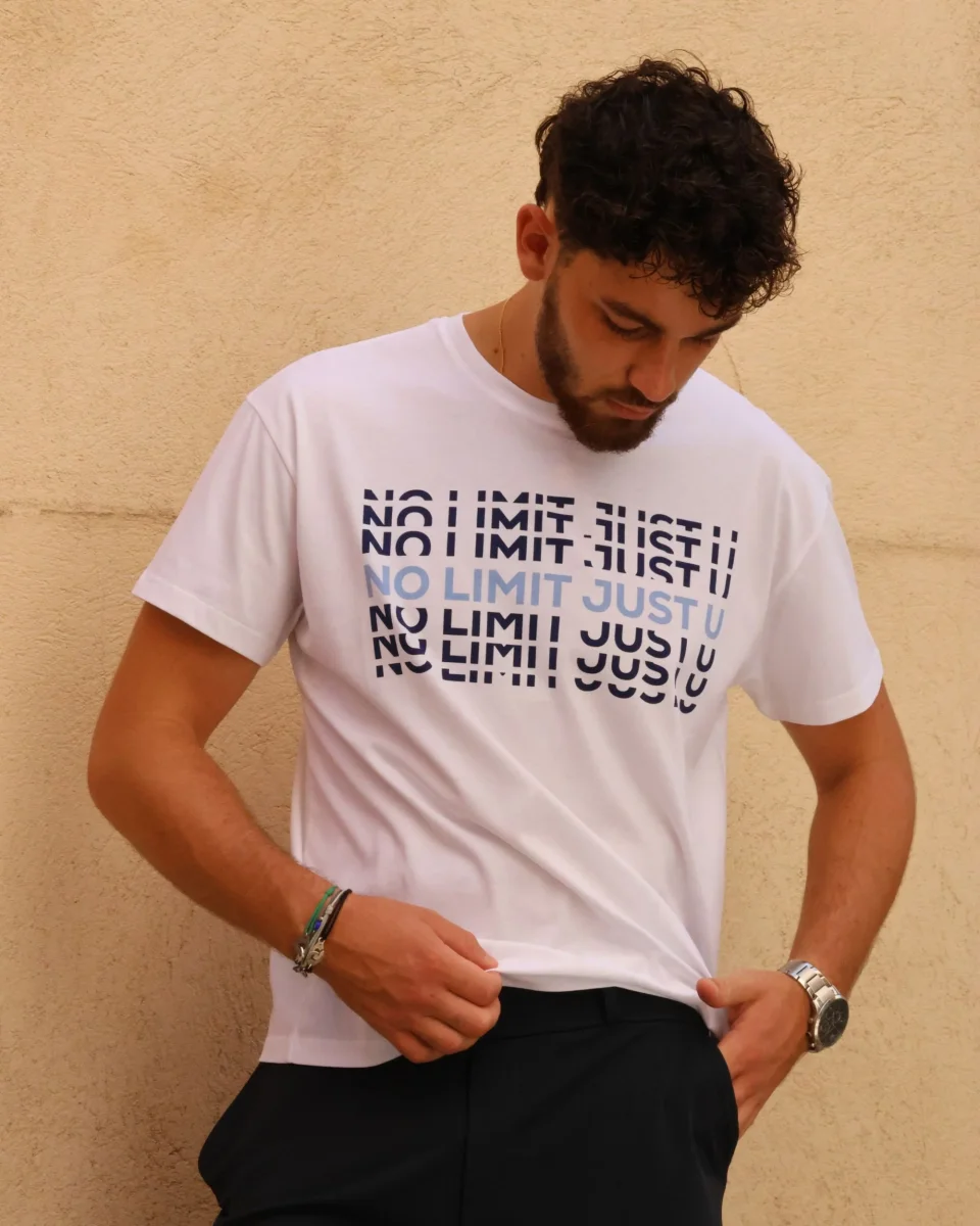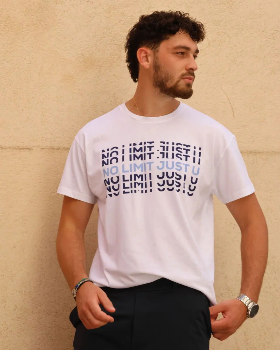 Andrea, c’est un t-shirt haut de gamme, imprimé avec notre fameux mantra « No Limit Just U » (vous pouvez le prononcer You) possédant des couleurs inspirées des fonds marins pour nous donner (encore plus) de force.